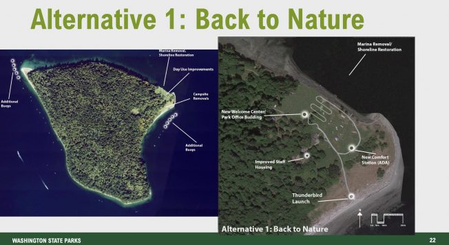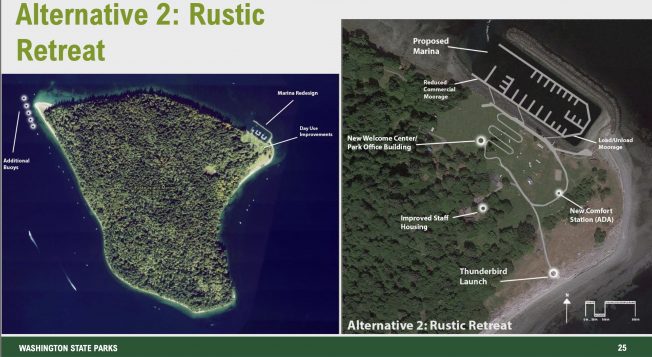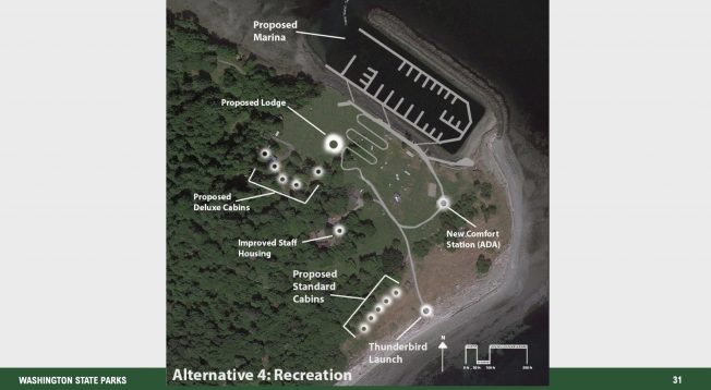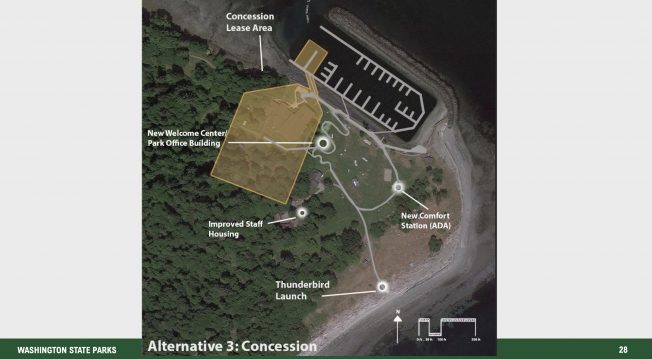 The master planning project comes at a time when visits to the park are down after the concession closure — a little more than 31,000 day-use visits in 2025 compared to almost 80,000 in 2019, when Argosy was still in the picture. More facilities and better access will mean more visitors, but a different kind of experience for those who have taken the trip in recent years and are used to just 200 people on the island on a busy day in July. That is part of why parks is asking the public to weigh in. They are looking at big-picture questions, like whether Tillicum Village could/should be renovated or a full-service restaurant added, how to improve the deteriorating marina, or just remove it entirely, and whether the state should look at an expansion of available buildings, services and access. State planners have clustered these into four main alternatives in a slide deck shown during a community meeting last month in Port Orchard: