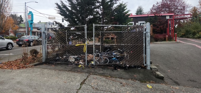 9:44 PM: Matching tonight’s photos to Google Street View, it was the dumpster corral just south of the ex-restaurant, which closed abruptly 10 months ago. (We recently asked City Light, the property owner, about their plans for it, and they replied, “The site is currently being evaluated for City Light’s purposes as part of our larger real estate portfolio. We are looking at both short-term options and long-term activation for utility purposes.”)