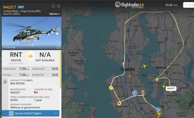 8:32 PM: And in fact, that’s what G-1 appears to have been up to, with loops around downtown and Mercer Island since leaving here – the screengrab is from Flightradar 24: