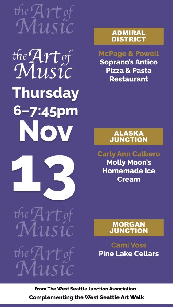 WEST SEATTLE ART WALK, WITH THE ART OF MUSIC: From Alki to Morgan Junction, enjoy art and music tonight – most venues with artist receptions are open 5-8; scroll through this list for those highlights. (Including, as previewed here, the Easy Street Records “double feature”!) And three Art of Music mini-concerts are set for 6 to 7:45 pm; scroll through this list to see who’s where and find out about their music.