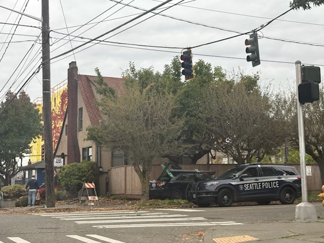 5:19 PM: For the second consecutive day, a driver has ended up on a business-district sidewalk in West Seattle. This time, it was the northwest corner of 42nd/Oregon – as shown by the street sign brought down on the car. We don’t know much about the circumstances, only that it was originally dispatched around 3:15 pm as a crash “with two patients,” neither described as seriously hurt/ill, and only one SFD engine was sent. (Yesterday’s car-on-sidewalk crash was at 16th/Roxbury.)
