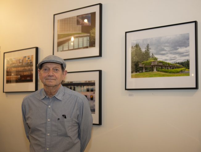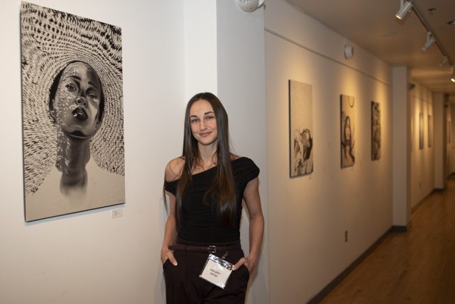 In The Junction, Anna Krumpos poses in front of “Shade” at ArtsWest>.