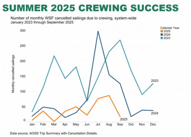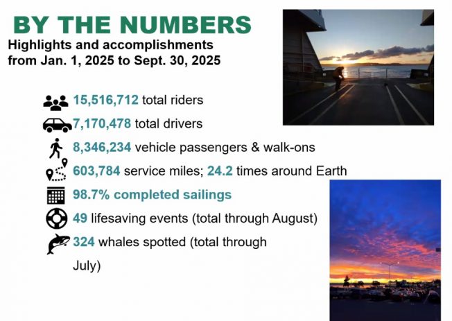 –Will fares go up every year? And why so “dramatic(ally)”? Vezina explained that WSF doesn’t set its fares – fare policy is set by the Legislature, for starters. Pre-pandemic, he said, WSF had 80 percent farebox recovery (fares covering costs), but now is closer to 50 percent. There won’t be a new “how much WSF needs to make from fares” policy next Legislative session, but there will be one the following year.