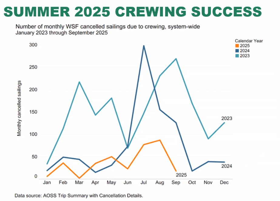 Bryn Hunter moderated. The first to speak was Steve Nevey, who’s been leading WSF for a year and a half. He said he set three strategic priorities at the start of his tenure and he feels they’ve “made great strides” toward achieving them. “We’re trending better by every metric (but) we still have a lot of work to do.” He said he’d proudest of a dramatic drop in cancellations related to crewing, attributed to hiring and training improvements.