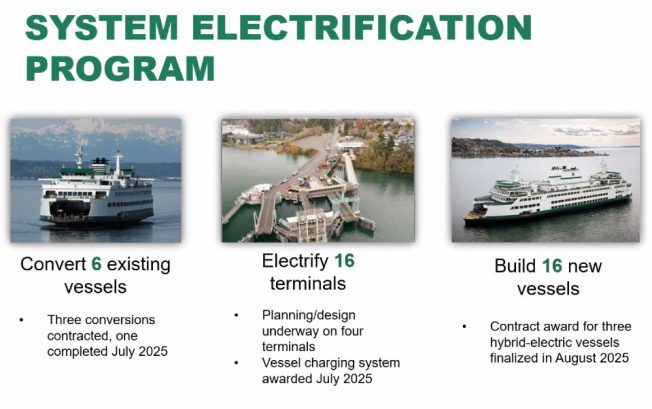 He said M/V Wenatchee is now back in service full time after its conversion, with 864 batteries installed; the other two Jumbo Mark II ferry conversions remain on hold until after the World Cup. Meantime, the new ferries to be built on the East Coast will start arriving in 2030, with the other two of the first three to arrive annually after that.