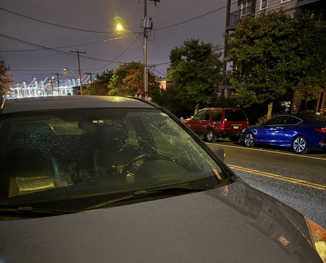 Smashed a bunch of windshields on Avalon last night in West Seattle. Here’s a couple photos, but there’s a lot more car smashed.