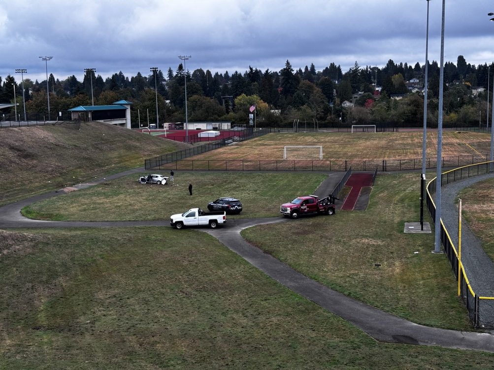 Thanks to David for the photo. This scene at Nino Cantu Southwest Athletic Complex followed reports in the 4 am hour of an unoccupied car rolling downhill, doors open, near 29th/Cloverdale, and of two drivers doing donuts in the NCSWAC lot, with one reportedly crashing through a fence. We’ve listened to archived police communication related to the incident; officers called in a white Hyundai Elantra that hadn’t been reported as stolen but had months-expired registration. David says reckless driving/vehicle stunts in the NCSWAC parking lot and vicinity “has been an ongoing problem in this neighborhood for years.”