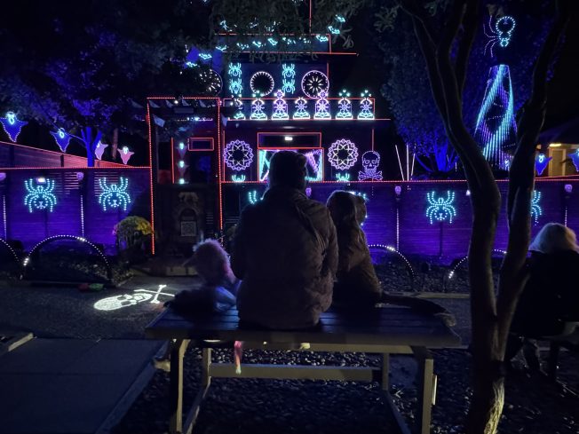 Thanks to Andrew for the photos and tip that the “4040 House” Halloween light show is now up and running. The team here puts on shows for Christmas season too; last year, though, nasty weather hit them hard, but they vowed to return for Halloween, and here they are.