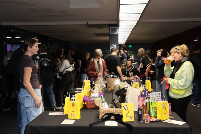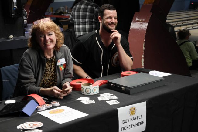 Our group shot of the crew running the show this year includes, third and fourth from left, founders Kendall Jones (publisher of Washington Beer Blog) and Kim Sharpe Jones. Besides bowling – with lanes booked by participants including local brewers and brew-pub proprietors – the night included raffles with prizes donated by businesses and other supporters: