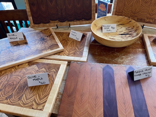 Pete Homan‘s creations can be used as cutting boards – or hung as wall art! Lots of jewelry too, including Zoë’s beaded creations: