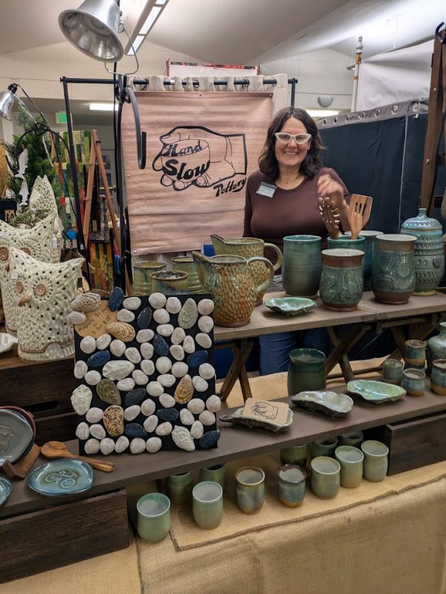 Right now in the Fauntleroy Church Fellowship Hall (9140 California SW), it’s opening night for the Fauntleroy Art Show – not just a show, but an opportunity to shop for locally created art and crafts – organizers sent photos. Below is one of the 19 local artists and artistic crafters (listed here) participating this year, Jessica Rasmusson of HandSlow Pottery: