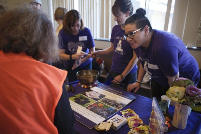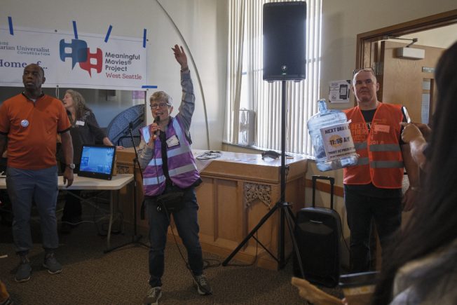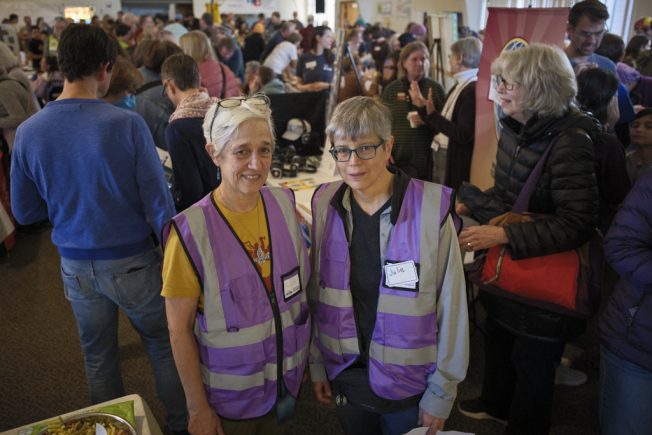 2:07 PM: Time’s passing quickly – less than one hour to get here if you haven’t been already! Adding more photos from Dave Gershgorn: first, below right is West Seattle Joiners organizer Julie Garbutt with Andrea O’Ferrall: