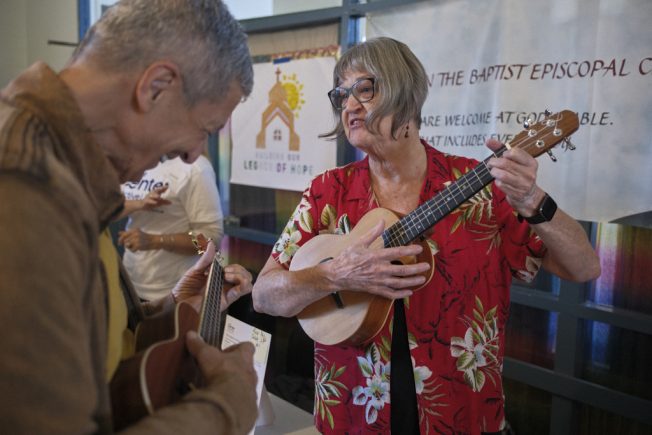 Paula Walters from West Seattle Ukulele Players teaches a song on ukulele.