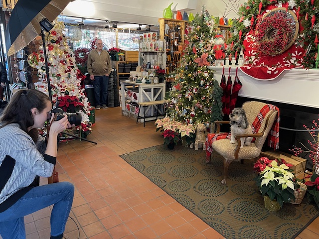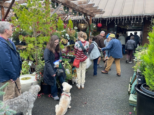 Now until 2 pm, the holiday season is in full bloom at West Seattle Nursery (California SW and SW Brandon; WSB sponsor) for its annual Holiday Open House. The full event schedule is here; above, free pet portraits with Element 79 Photography are continuing until 1 pm. (That’s Henry, posing.) This is the second year that pet photos have been part of the open house – they were so popular last year, the nursery decided on an encore. Lots of patient pups and people waiting today, too: