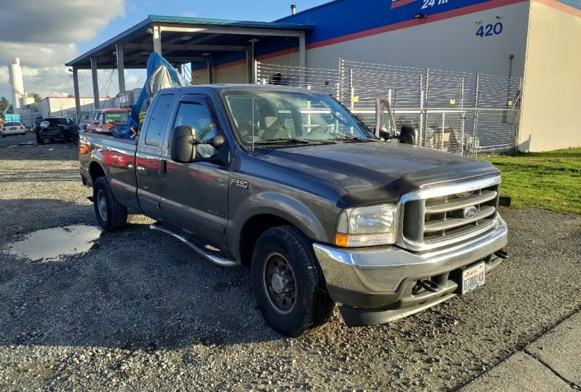 2003 Ford F-250, plate B70024X; Takeuchi TB135 with melted roof. Trailer is old AA Rental trailer, license 74005NZ.