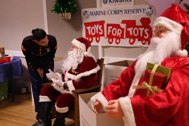 Marines including Cpl. E4 Devan Sanchez are there for the toy drive, and Santa is there for pics: