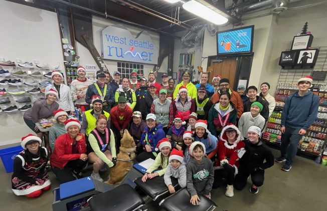 Some of the greater Admiral area’s most brightly decorated homes might have noticed a large group of visitors on foot tonight: The annual West Seattle Runner (WSB sponsor) Christmas Lights Run left the shop at 2743 California SW just after 5 pm. First, of course, the traditional group shot – here are the 30+ people who defied the rain (as runners tend to do) to take part: