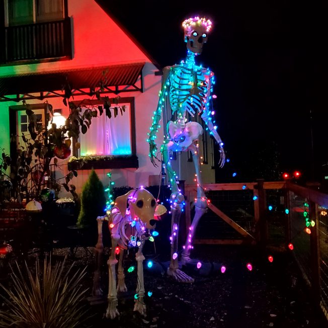 Tonight’s spotlight falls on an example of the Halloween/Christmas decoration fusion that seems to become a bit more common each year. Scouting light sites for WSB, Cindi spotted this at 46th and Admiral, nicknaming it the ‘Gruesome Twosome.” Tomorrow, it’s back to Christmas characters, as we dig back into the stack of reader contributions – thanks to everybody who keeps sending those to westseattleblog@gmail.com!