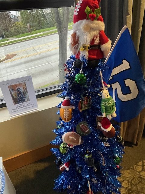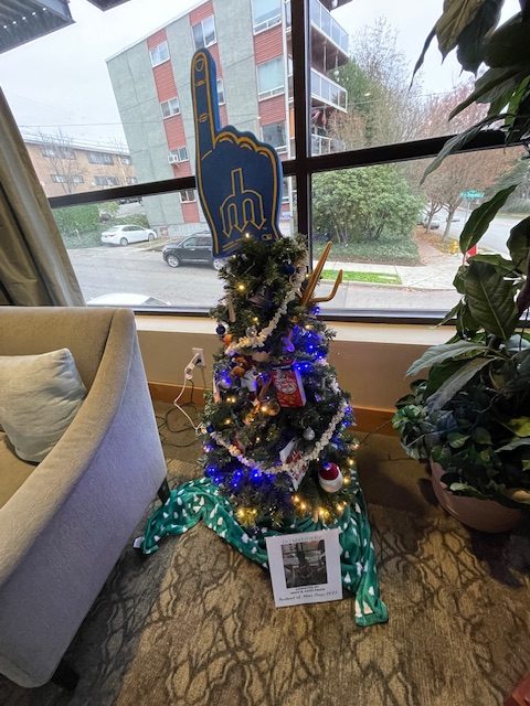 Thursday night, 5:30-7:30 pm, you’re invited to Brookdale West Seattle (4611 35th SW) for a holiday event during which more than a dozen decorated mini-trees will be silent-auctioned by the Rotary Club of West Seattle Foundation to raise money for community projects. Daily through then, the Brookdale lobby is open to visitors, 9 am-5 pm, for a preview. Here are just a few – a tree donated by Kelli’s Child Care that’s perfect for Seahawks fans: