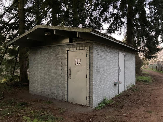PARKS PROJECTS: First one presented was the south Westcrest Park restroom rebuild. Planner Tizai Mauto was introduced as Parks’ Southwest District planner and brought his team, including Justin Martin, a landscape architect from MIG, who gave most of the presentation on the restroom project. It’s in a conceptual design phase with three options. This is meant to replace the old long-closed restroom (photo above). A secondary goal is to remove infrstructure left over from an old long-removed play area near there, and to replace picnic tables and benches. Total budget for the restroom and the play area: $1.35 million.