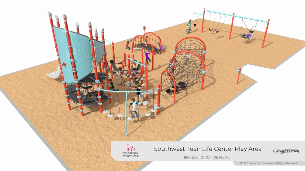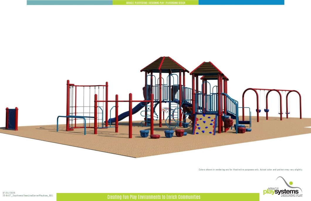 Next, the Southwest Teen Life Center play-area overhaul, presented by project manager Colin Campbell, who said planning is resuming after a yearlong pause; he brought equipment option info.