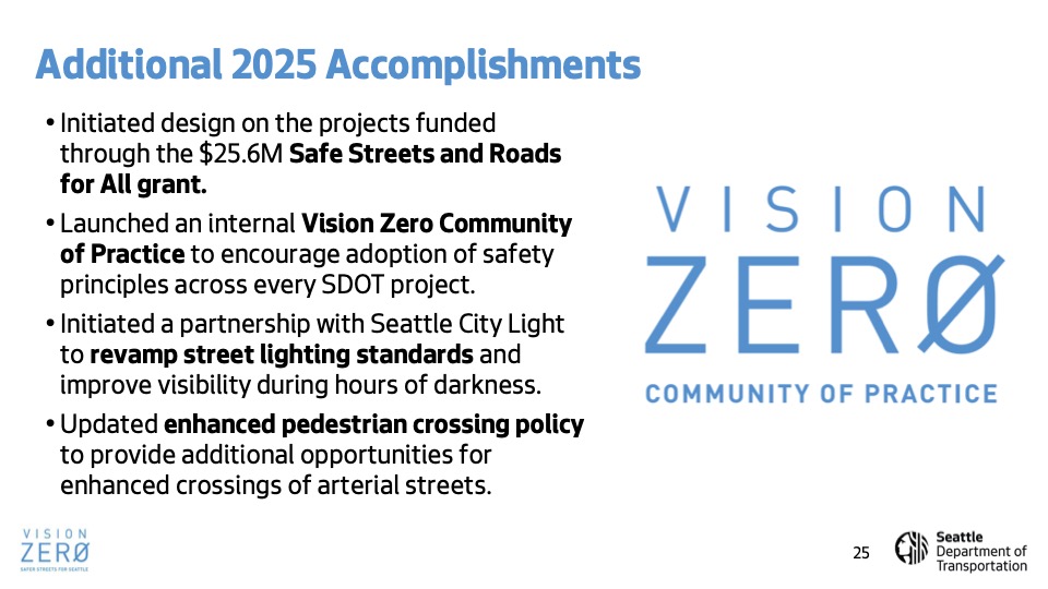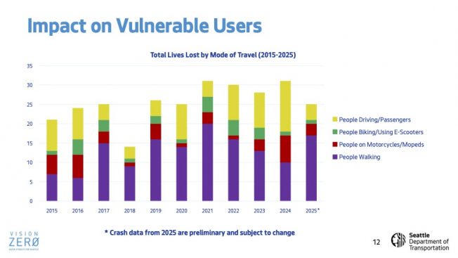 As previewed here, the newly expanded-in-scope committee chaired by District 1 City Councilmember Rob Saka got a general SDOT update during its first meeting of the year. The department’s new director Angela Brady was there for the meeeting of the Transportation, Waterfront, and Seattle Center Committee, but mostly to introduce chief transportation-safety officer Venu Nemani, who led most of the briefing. As shown in the slide deck presented during the meeting, 25 people were killed on Seattle streets last year, mostly people on foot: