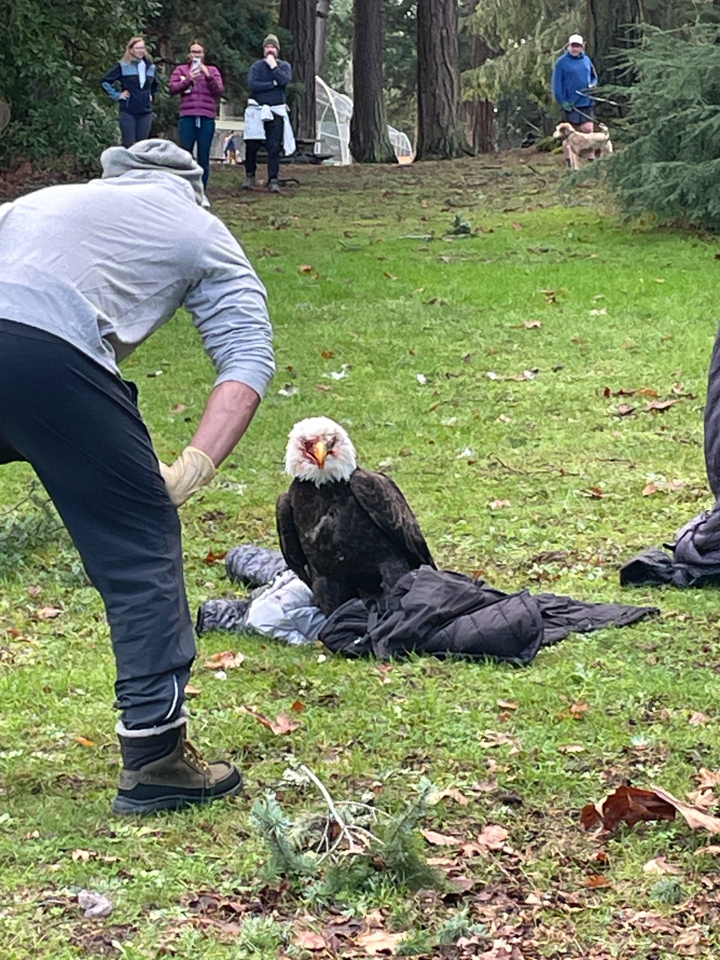 The summary above was written by someone who did not witness the event. The birds most definitely did not disentangle themselves. My friend and I were just arriving at the park when a crowd of crows was making a huge ruckus in a tree close to Fauntleroy. The pair of eagles were on the ground already when we got near. A woman whose name I didn’t catch and Mr. Yount gathered coats, trying to calm and separate the eagles. When it was apparent that the birds were entangled, they both held them while Jovan worked to remove the talons from the injured eagle’s head (very close to its eye). A handful of onlookers brainstormed and shared ideas and resources. Both Animal Control and WDFW came. Fortunately Kersti Muul came with a larger carrier that could be used to transport the injured eagle to PAWS, which the unknown woman and her husband volunteered to do. Thanks to everyone involved who did the best they could under the circumstances.