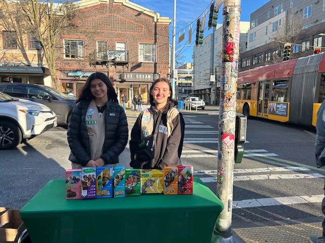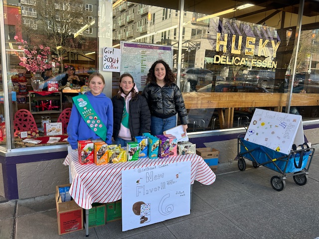, and Liv, three members of Troop 46258, had a table and signage outside Husky Deli. They drew attention to a “New Flavor!!!” called Exploremores, described as “a Rocky Road ice cream-inspired cookie filled with chocolate marshmallow and toasted almond creme,” per their sign. The crew has been part of Girl Scouts of Western Washington for four years: