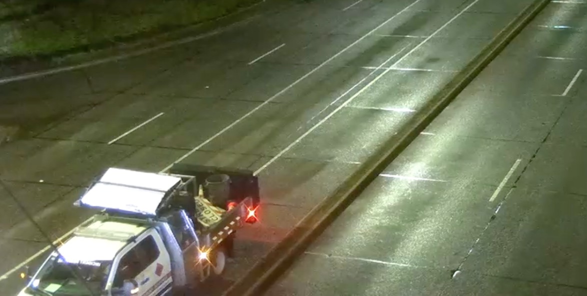 9:34 PM: We don’t know how long the closure lasted but it’s over now, with eastbound traffic streaming back onto the bridge, and an SDOT Response Team truck being reloaded with the signage that was in place just out of the camera’s view.