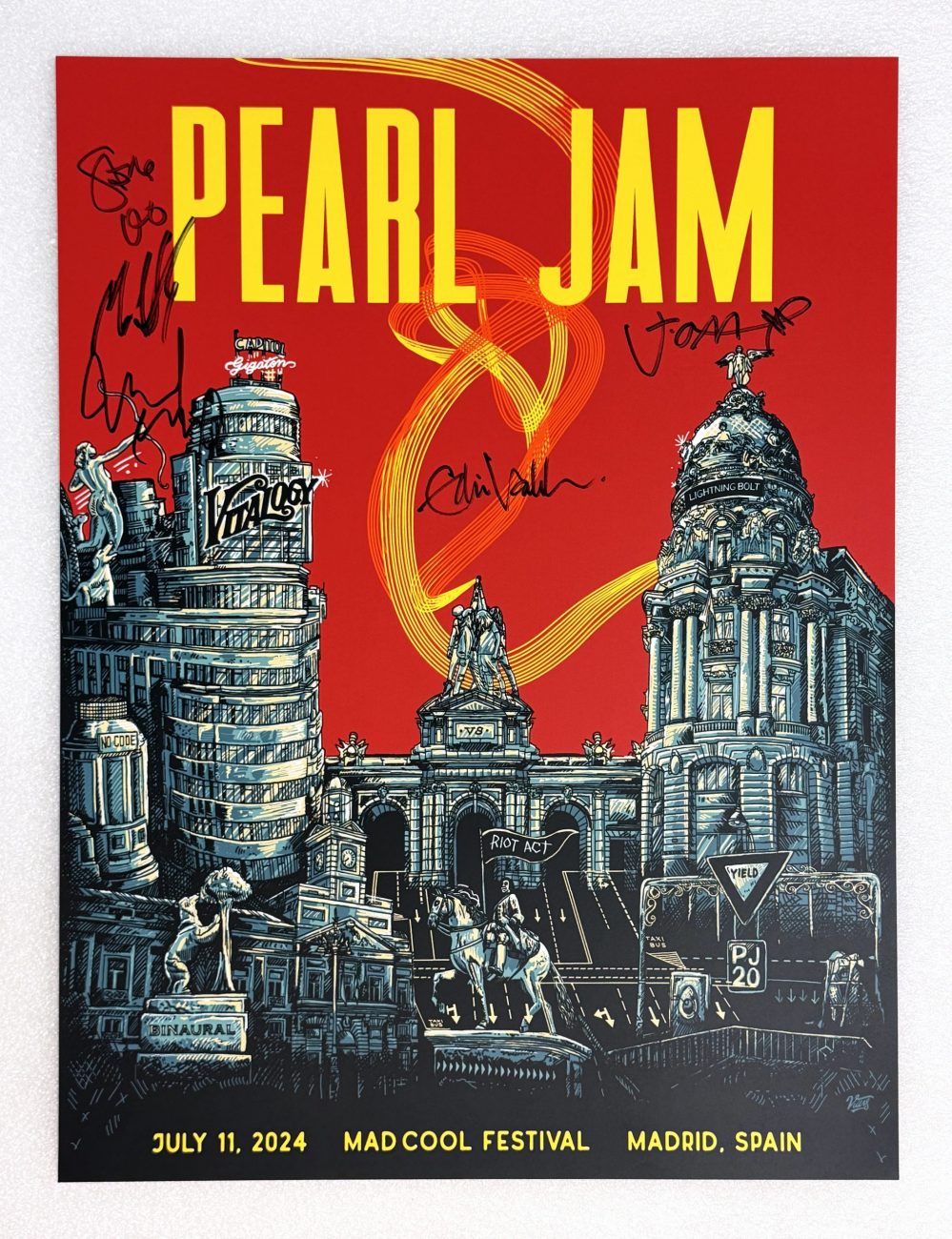 The effort has even caught the attention of a famous neighbor. Musician Eddie Vedder has generously donated a Fender electric guitar signed by all five members of Pearl Jam (photo above), along with a poster also signed by the band (photo below). The signed guitar will be featured in the live auction on March 28.