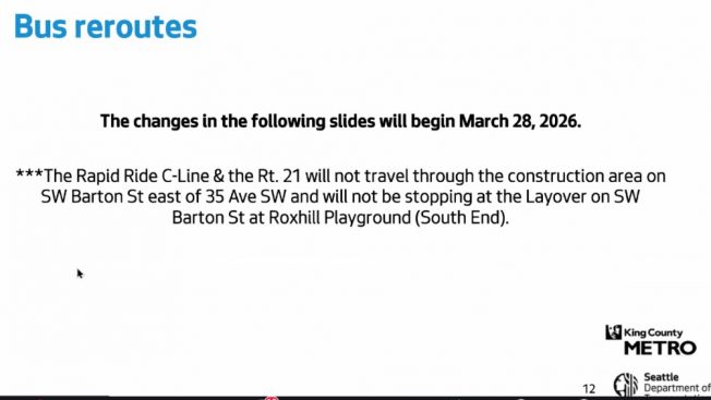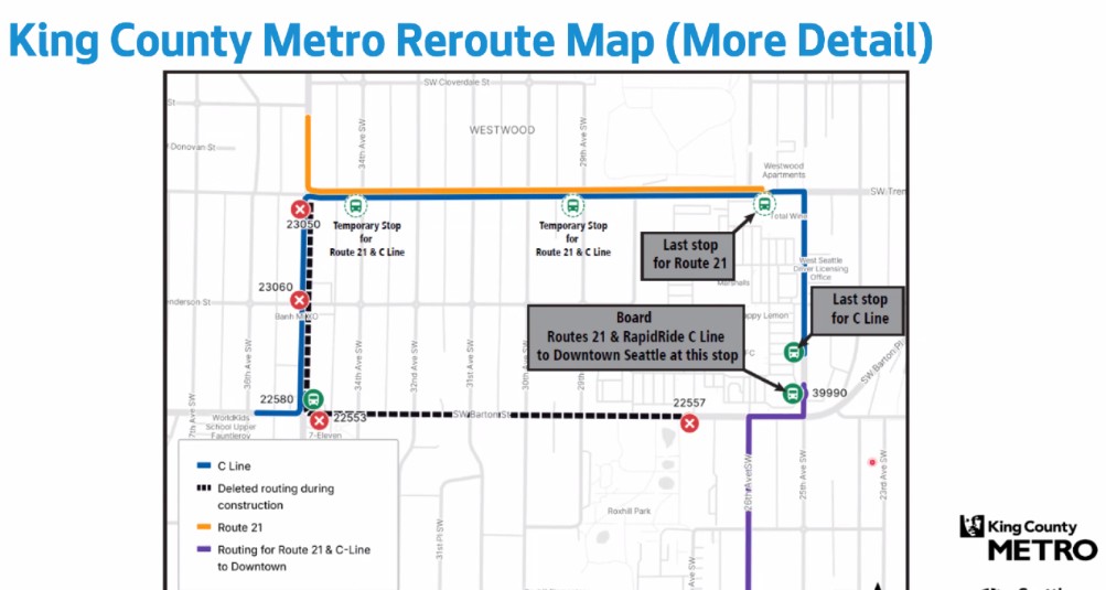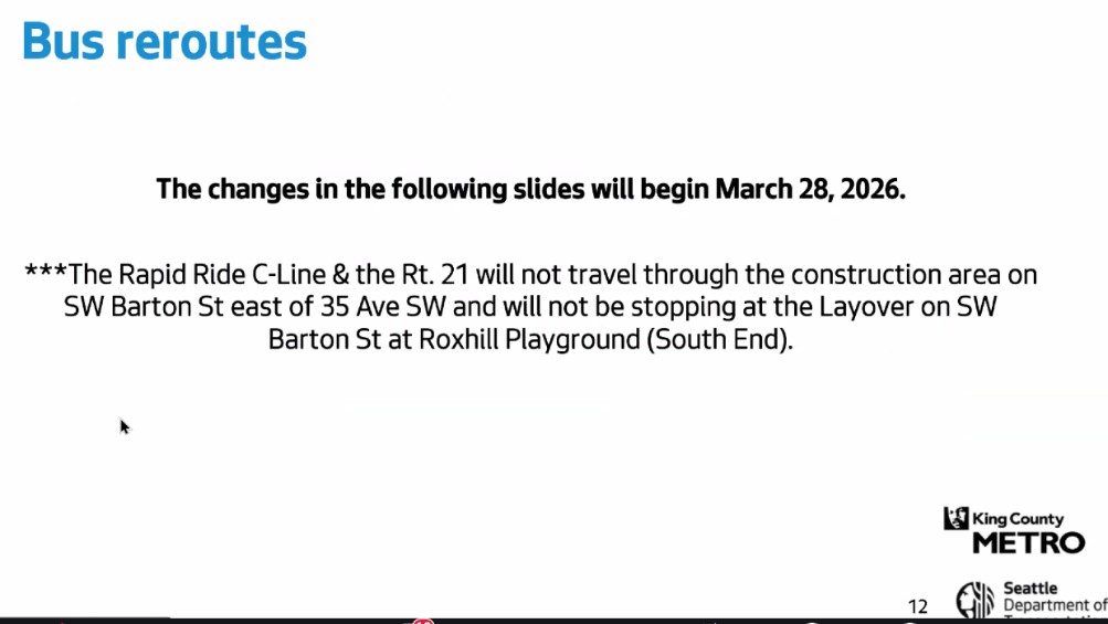 The meeting led by SDOT and Metro reps is the one promised last year when the project was postponed and a planned in-person meeting was scrapped. It also underscored the fact that this will not be a simple or short project – the work required to build new pavement panels in concrete between 26th SW and 29th SW is expected to start sometime in April and last until sometime in fall. But because April is so close to Metro’s twice-yearly service change, the bus-routing changes will kick in starting Saturday, March 28: