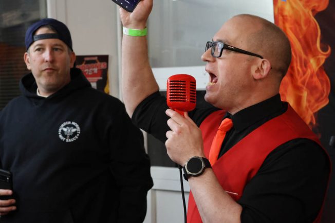 As the wings’ arrival neared, the room was reconfigured with two long tables for participants. Emcee Steve Cole, wearing a suit the color of most hot sauces, barked out the rules (most notably “you only have to take one bite” to survive a round of wings).