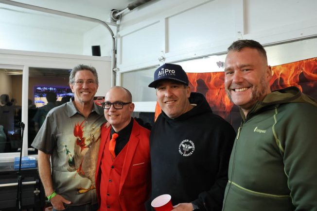 Party host was Sean Cummings, proprietor of All-Pro Painting, who noted that he and his friends’ kids are now teenagers and they bring the fire, so to speak. The party started two hours before the wings, which were prepared by Claiborne Bell and team at nearby Distinguished Foods Kitchens. Live music shook the shop courtesy of Ruston Rock – “my mom’s kick-ass cover band,” as Sean explained it.