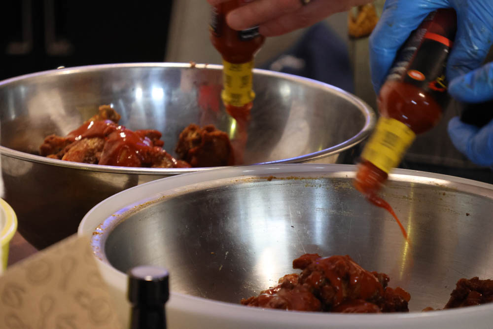 They took a count of who was in it for wings (including three vegetarians). The sauces were announced as the wings were distributed: