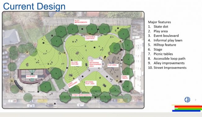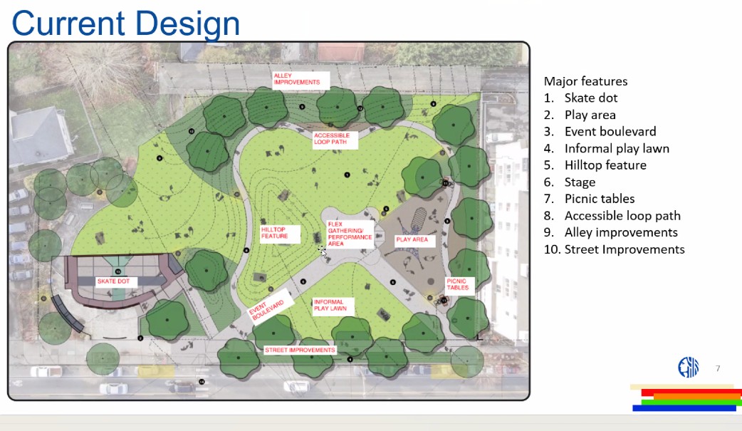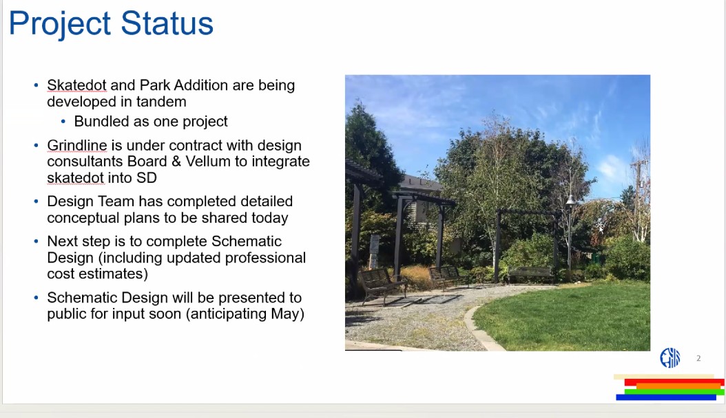 MORGAN JUNCTION PARK ADDITION SKATEDOT: Project team leaders from Seattle Parks presented this update on the project incorporating the currently fenced lot north of the existing park – here are their key slides: