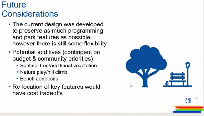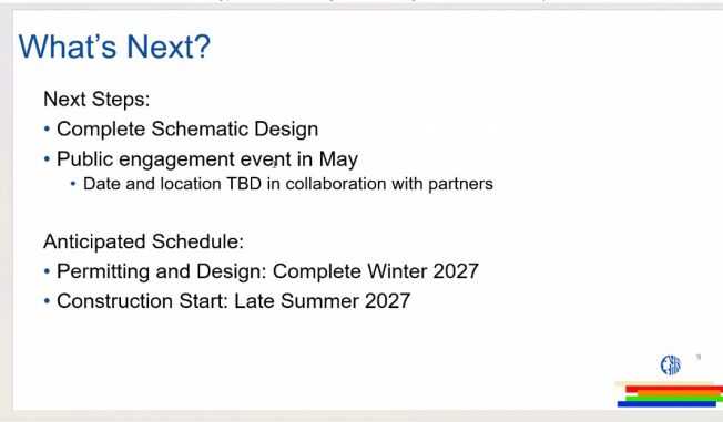 Next steps include a community-engagement event, likely sometime in May, and more design work that should lead to an accurate cost that would help determine whether there could be “additives” to the project such as a “sentinel tree,” a natural play area, or adoptable benches. The newest projected construction timeline is for work to start in “late summer” of 2027.