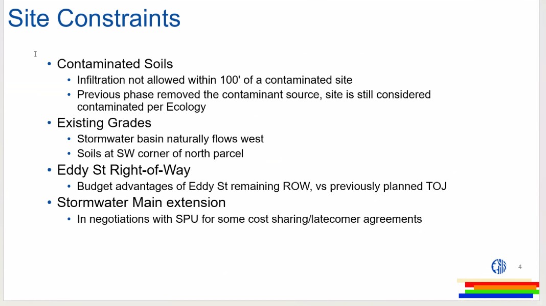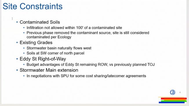 Despite the soil removal that’s been done, the site is still considered contaminated, so the soil piled at the northwest edge of the site needs to stay – “moving it could be quite expensive.” There’s also still a lot of behind-the-scenes technicalities the Parks team is dealing with, such as having to extend the site’s stormwater main, and working out what the status of the SW Eddy right-of-way between the existing park and the addition site – it might not simply be transferred from SDOT to SPR after all. Access to utility poles along the site’s rear alley is being worked on too.