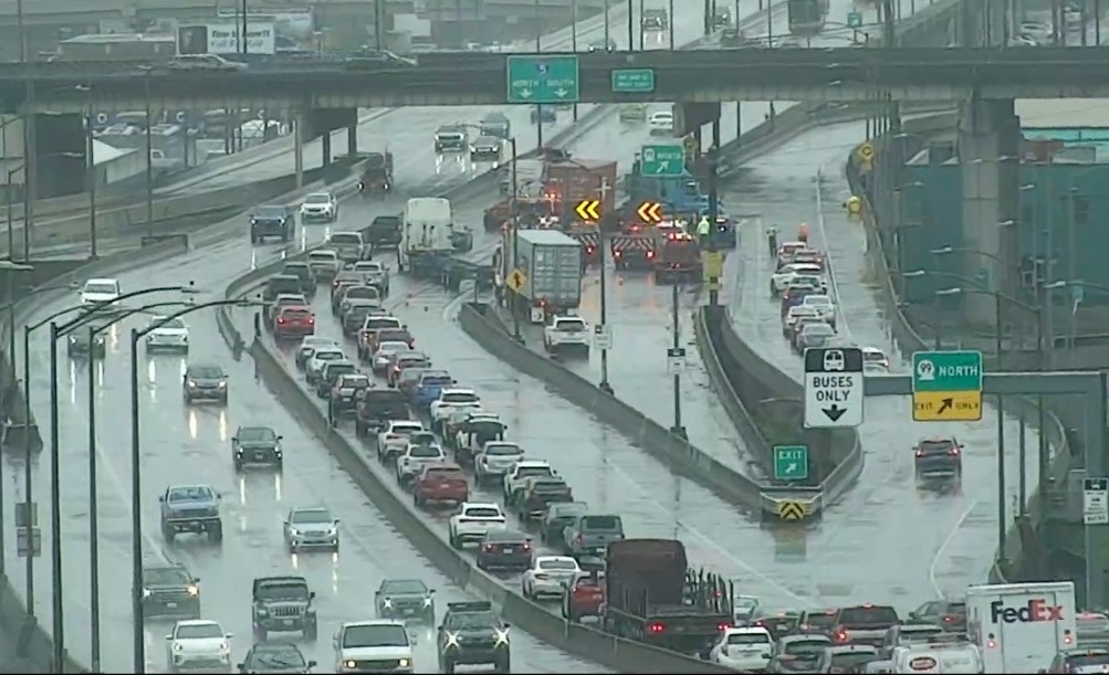 1:29 PM: Not cleared yet and the response has expanded, so traffic past the scene is more sluggish, as the updated traffic-cam screenshot (from a few minutes ago) shows.