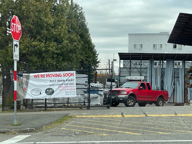 Thanks for the tips! “We’re Moving Soon” banners like the one in our photo have gone up around the longtime Alki Lumber yard in The Triangle. So, readers asked, how soon is “soon”? The exact date isn’t finalized yet but “very” soon, Alki Lumber tells us, likely within weeks, with more details expected shortly. As we first reported four years ago, Alki Lumber is owned by Marine Lumber, sold by the Sweeney family after a century. Its new location is in South Park – 558 S. Kenyon. It’s been seven years since the Sweeneys announced they were studying options for their Triangle property’s future; they subsequently made plans for two buildings on what became known as the Sweeney Blocks, with hundreds of apartments.