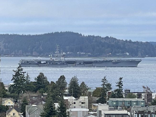 Off West Seattle a short time ago, that’s the U.S. Navy‘s oldest aircraft carrier, USS Nimitz (CVN-68), leaving Puget Sound one last time, three months after returning to Bremerton following its final deployment.