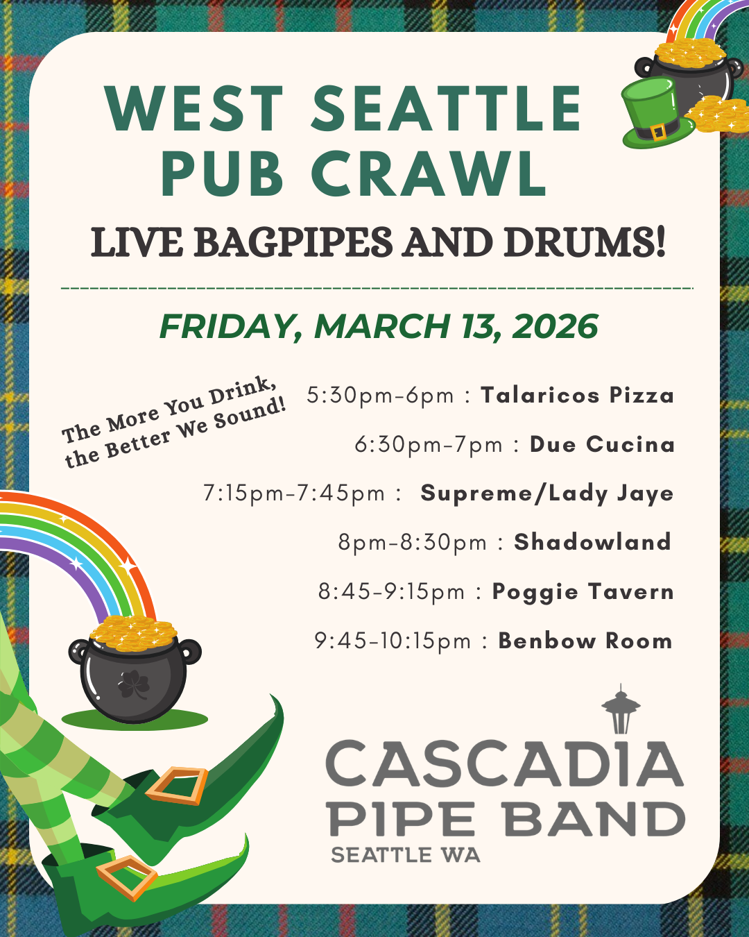 Cascadia performs at community events, parades, and competitions throughout the Seattle area, and events like this help the band raise funds to travel to Scotland to compete in the World Pipe Band Championships. We tied for 6th place last year! It should be a lively way to celebrate St. Patrick’s Day weekend while supporting local businesses and bringing a little bagpipe cheer to West Seattle.