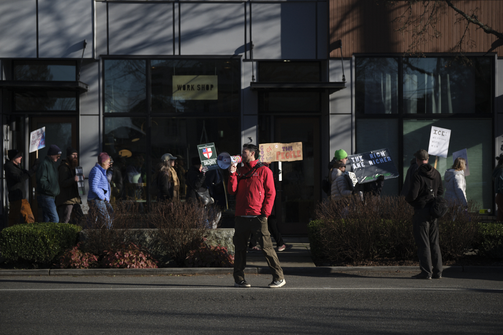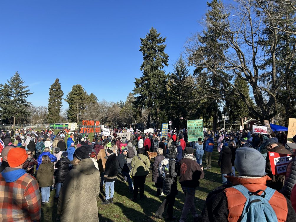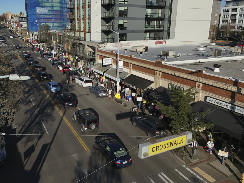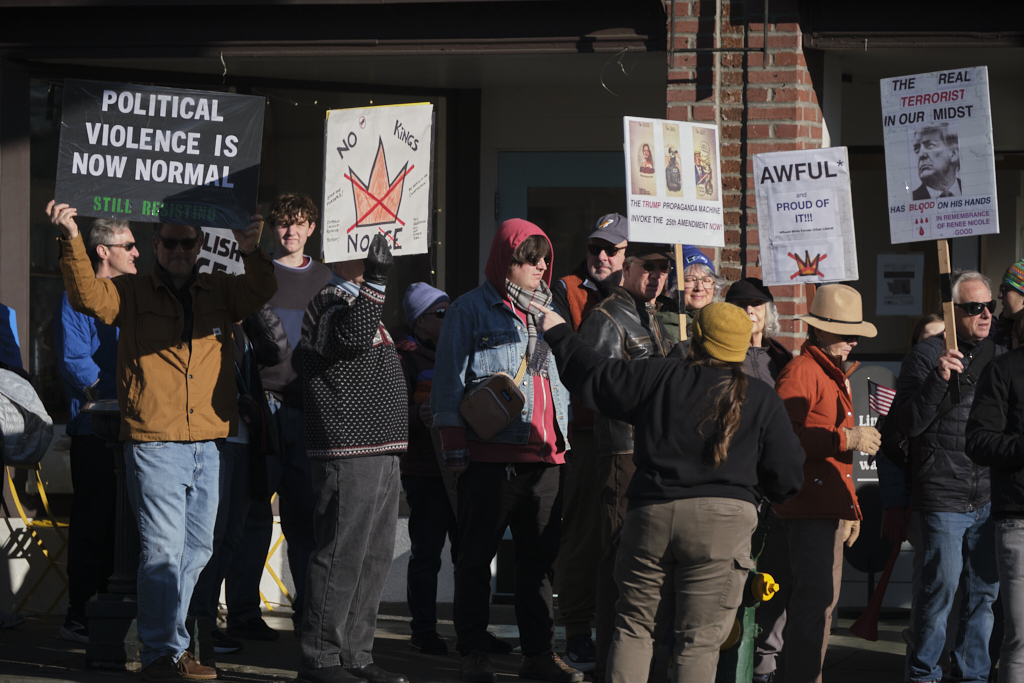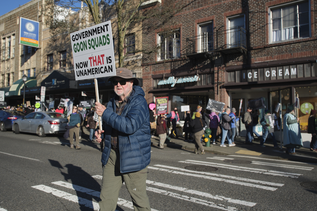 “‘We came in today ready to mark the first 365 days of this atrocious administration…and then this morning in Minnesota, there was another killing that happened,” said Laurie Reinhardt, co-director of West Seattle Indivisible. “So that has put us in a head space and heart space where we are committed to nonviolence and peace… it’s demonstrating at the same time that our hearts are hurting.”