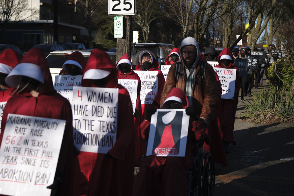 Other participants were dressed as handmaids from Margaret Atwood‘s “The Handmaid’s Tale,” the famous novek about the consequences of heavily patriarchal rule under a theonomic version of the United States. They were bearing signs with statistics showing the ways in which reproductive care and the rights of women have gotten worse since 2022’s overturning of Roe v. Wade.