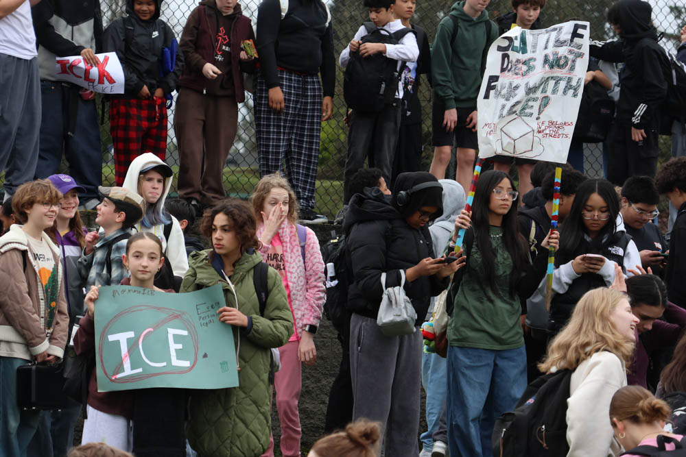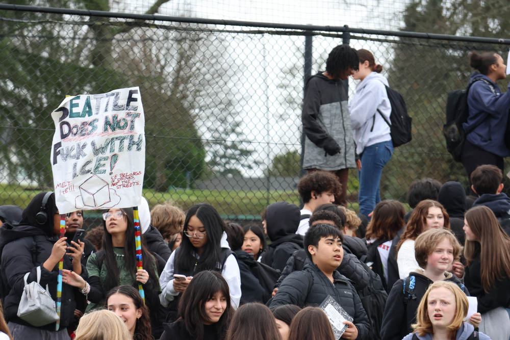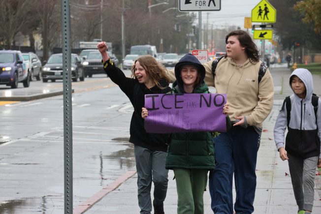 Thanks to everyone who tipped us (mostly via our text hotline, 206-293-6302) about student walkouts as part of today’s “national shutdown” to protest deadly violence during federal immigration enforcement. We mentioned the walkout plans in our ongoing list of shutdown participation and we sent a photographer out to see if they happened.