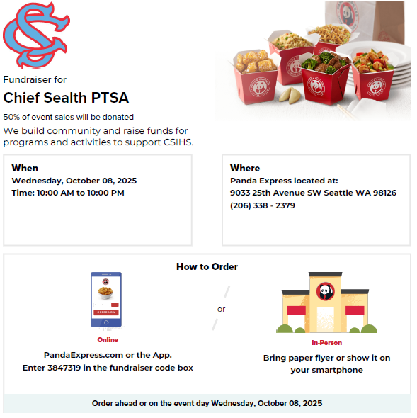 Part of the proceeds go to CSIHS PTSA. If ordering online, use code 3847319. Otherwise, tell them you’re there for the benefit.