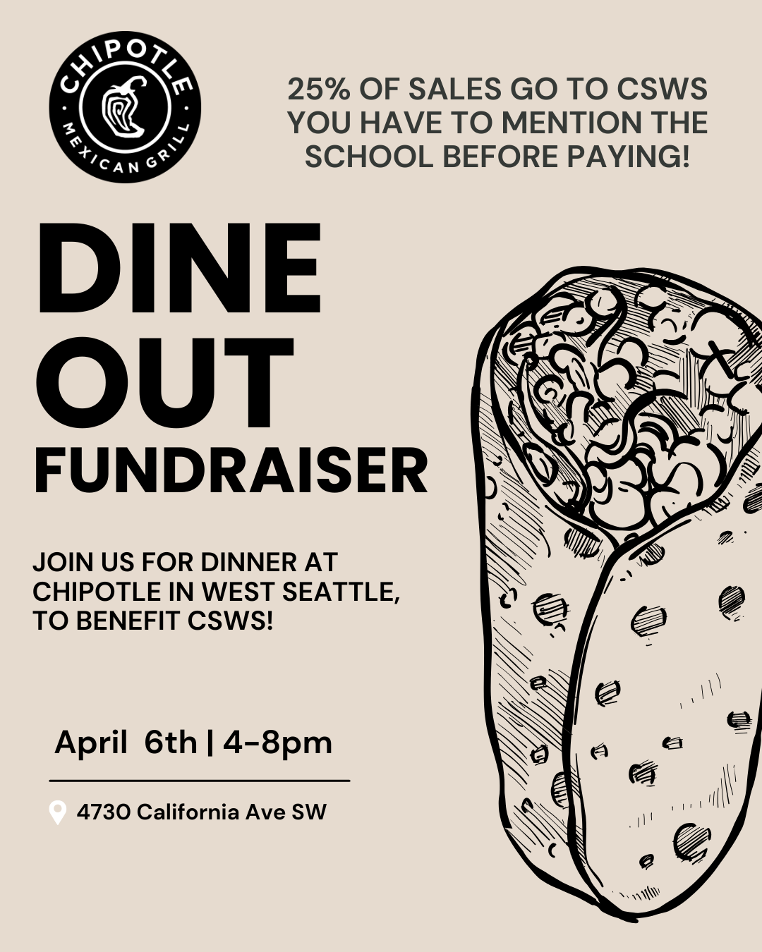 Please join us on April 6th from 4-8pm to raise money for Community School of West Seattle! We’ll be dining out at Chipotle on California Ave and 25% of all purchases will be donated to CSWS. You have to mention the fundraiser/school before you pay in order for CSWS to get credit.