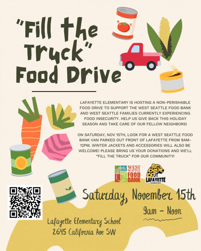 On Saturday, November 15th from 9 am – Noon Lafayette Elementary School will be supporting the West Seattle Food Bank by collecting canned and non-perishable food for a “Fill the Truck” community food drive.