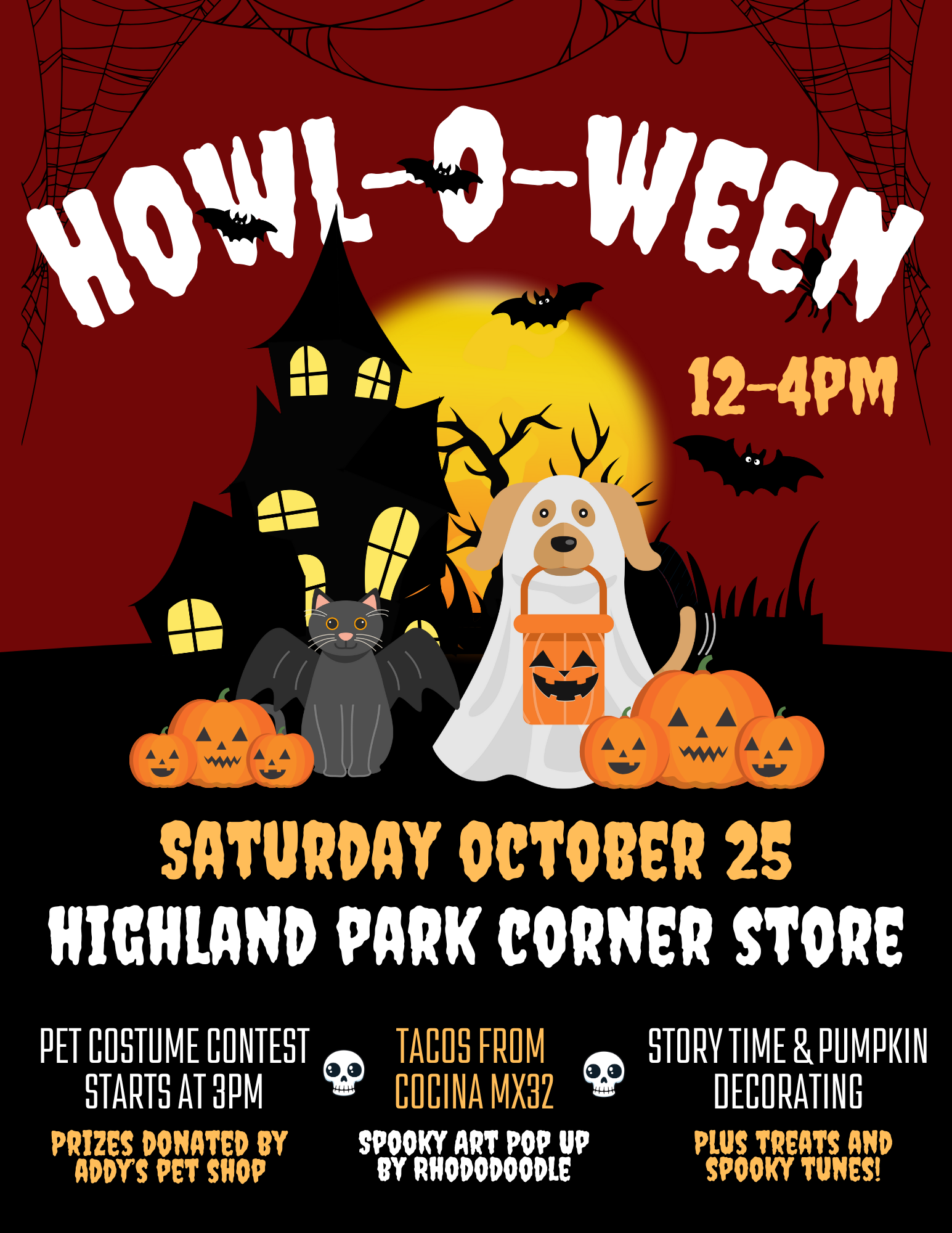 Where: Highland Park Corner StoreGet ready to paw-ty at our annual Halloween party and pet costume contest at Highland Park Corner Store! Join us on Saturday October 25 from 12-4pm – we’ll have Cocina MX32 here serving tacos, pumpkin decorating and story time, a spooky art pop up from Rhododoodle, plus thrilling tunes and tasty treats – and the mane event, the Pet Costume Contest!