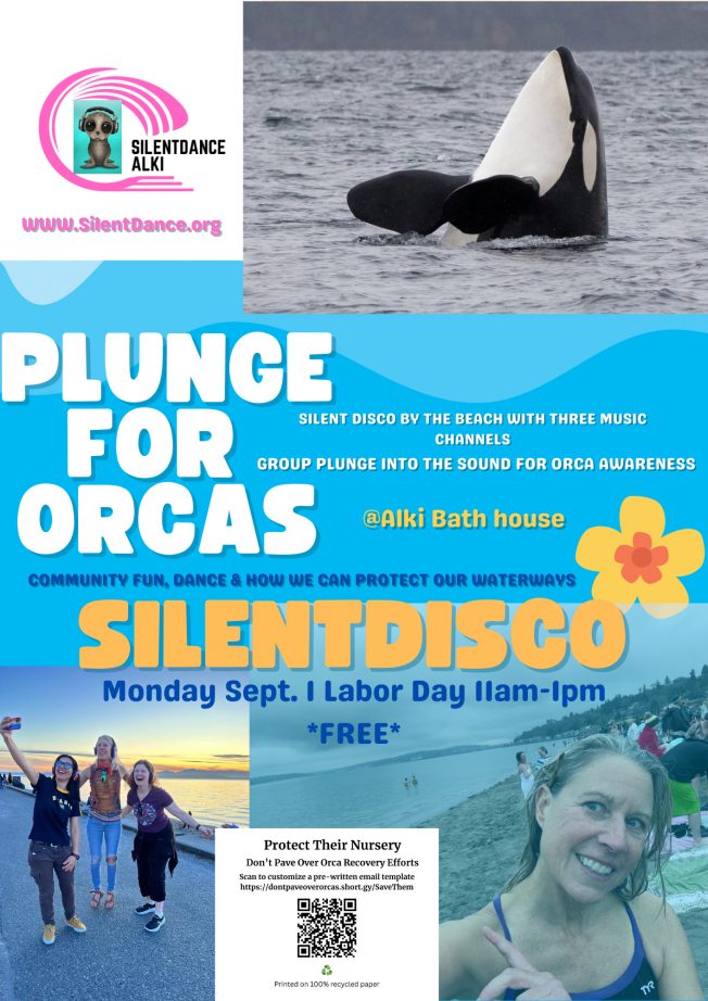 at Alki Bathhouse areaSilent Disco with three channels. Group plunge into the Sound. Community fun, dance, and learn how we can protect our waterways.