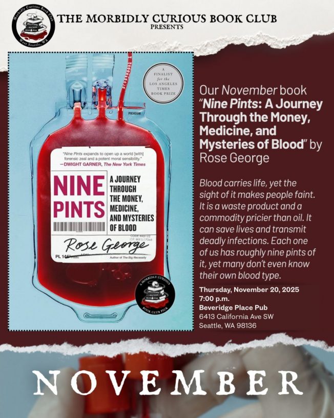 This month’s Book is “Nine Pints, a Journey through the Money, Medicine, and Mysteries of Blood” by Rose George. Our meeting is on November 20, 2025, at 7:00 p.m. at Beveridge Place Pub.